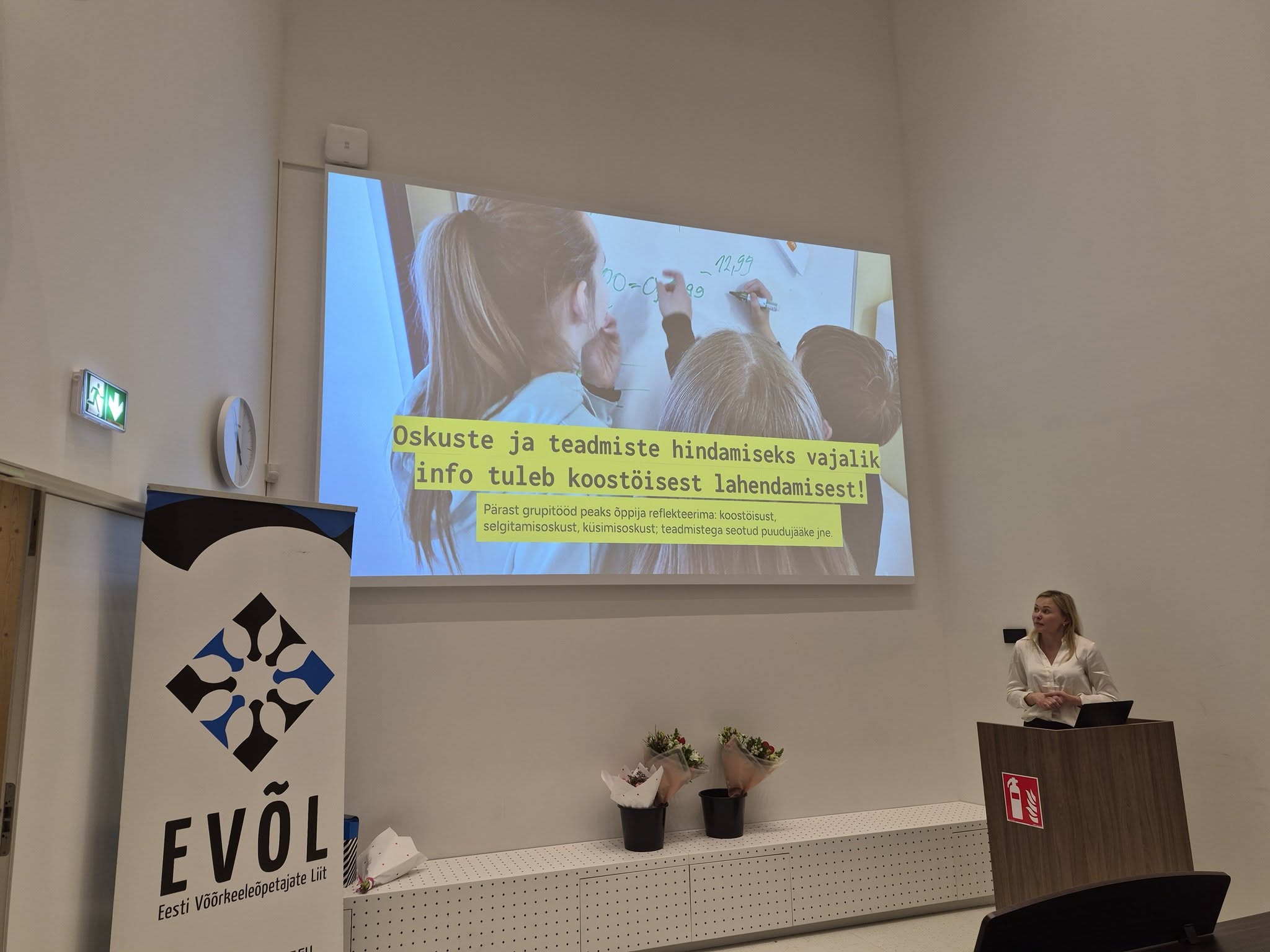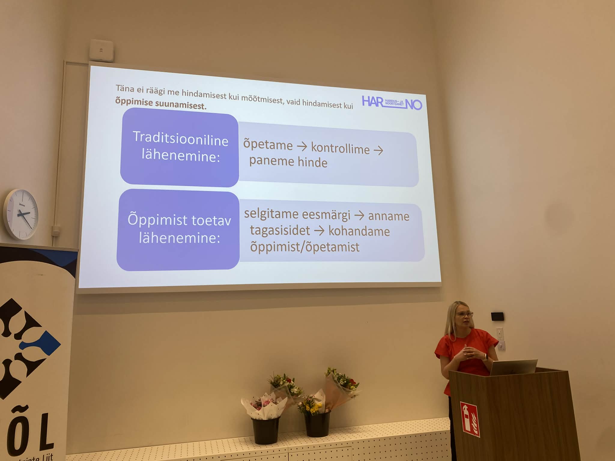 Haridus- ja Noorteameti keelevaldkonnajuht Nele Toime avas riigi haridus- ja noortepoliitika rakendamise vaatekohast testimise, www.eis.harno.ee keskkonna, õppimist toetavast tagasisidestamise ja hindamisvahendite teema. Testid, e-kogud on vahendid, mis ei toeta õppimist, aga nende kasutusvoos toetab õpilase arengutee jälgimist. Õppimist toetav hindamine on see, kui õppija saab aru, mida ta õpib ja õppija teab, kus ta oma arengus on.