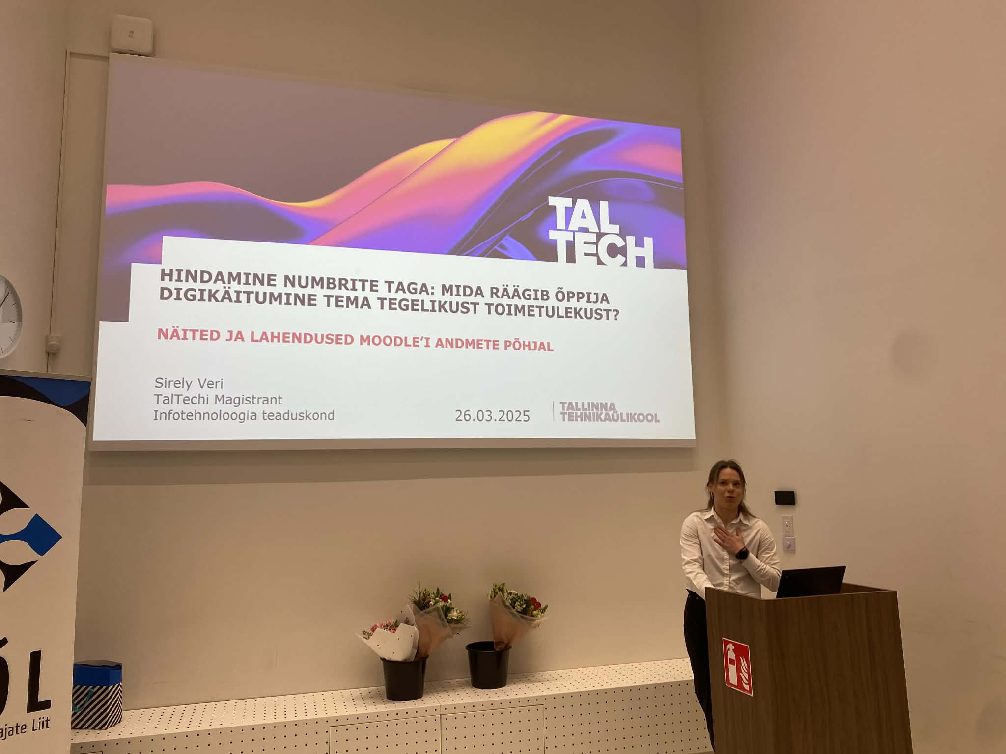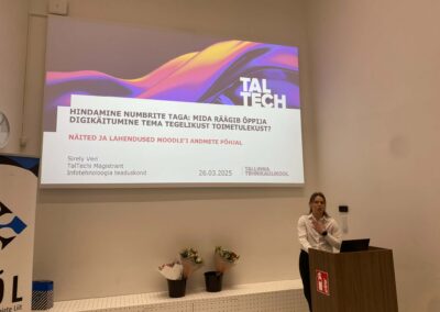 Koolituspäeva lõpetas TalTechi üliõpilane Sirely Veri, kes rääkims oma õpianalüütika tegurite komplektist, mida ta bakalauruse töö raames uuris eesmärgiga välja selgitada, mis toetaks õpilast kursuse lõpuni positiivsetele tulemustele õppimiseks. Mis ta teada sai? Tema uuringust selgus, et kursusel veedetud aeg ehk kohalkäimine on oluline näitaja positiivse lõpptulemuseni jõudmisel. Need õpilased, kes alustasid oma tööde tegemisega enne tähtaega, edenesid paremini. Kui on näha õpilase tagasilangust, tuleb sekkuda läbi aktiivsuse jälgimise kohe esimestel tundidel ja nädalatel. Sirely uuring tõi välja veel ka paindlikku ja mõisvtat suhtlemise ja suhtumise olulisust õpetaja ja õpilaste vahel. Ta soovitas näiteks lisada konsultatsioonikutse hinde juurde tagasisidesse, digitaalset nügimist „ Hea õpilane…., Sul on tegemata, tuletan Sulle meelde….”.